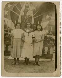 [Mujeres delante de telón de fondo con la imagen de la Vírgen del Carmen] [fotografía]. [Chile : entre 1940 y 1950]. 1 fotografía : monocromo, gelatina sobre papel fibra ; 9 x 7 cm .