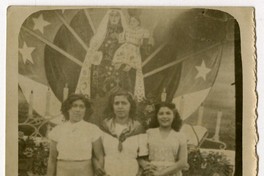 Dos mujeres y una joven, aparecen en la fotografía de pie delante de telón de fondo, en el que se observa la pintura de la Vírgen del Carmen con adornos florales.