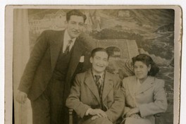 Una mujer y dos hombres, aparecen en la fotografía sentados en una banca y delante de telón de fondo, en el que se aprecia la pintura de un paisaje montañoso, con construcciones y un tunel.