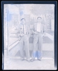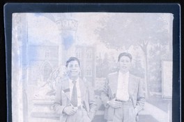 [Hombres delante de telón de fondo] [fotografía]. [Chile : entre 1940 y 1950]. 1 fotografía : negativo sobre papel ; 9 x 7 cm .