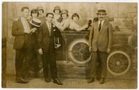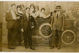 [Personas adelante y atrás de automóvil pintado en telón de fondo] [fotografía]. [Chile : entre 1920 y 1930]. 1 fotografía : monocromo, gelatina sobre papel fibra ; 9 x 14 cm .