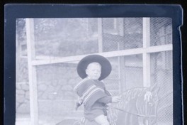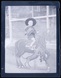 [Niño sobre poni pintado en telón] [fotografía]. [Chile : entre 1940 y 1950]. 1 fotografía : negativo sobre papel ; 9 x 7 cm .