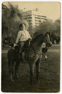 [Niño sobre poni de utilería en una plaza] [fotografía]. [Chile : entre 1950 y 1960]. 1 fotografía : monocromo, gelatina sobre papel fibra ; 14 x 9 cm .