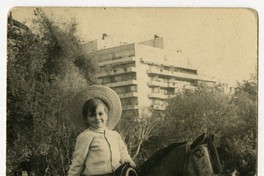 Niño con chupalla, aparece en la fotografía sobre poni de utilería en una plaza pública en la que se observa a otras personas alrededor, y de fondo, un edificio residencial con balcones.