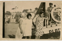 Una mujer mayor y dos jovenes, aparecen en la fotografía al lado de bote "Mar del Plata", en el que se observa a un niño en su interior sosteniendo el timón junto a una de las jovenes retratadas en ese balneario. En el timón está escrito "Reina del [M..] Balneario". En la vela de la embarcación se observa la imagen del mar y de una gaviota. De fondo, las construcciones de ese balneario no identificado.