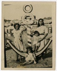 [Familia alrededor de una imitación de ancla en balneario de Cartagena] [fotografía]. Cartagena : 1950. 1 fotografía: monocromo, gelatina sobre papel fibra ; 9 x 7 cm .