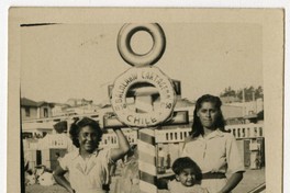 Mujer, joven y niños, aparecen en la fotografía alrededor de un ancla formada en el brazo por dos flechas, y en la caña, por un pilar delgado y con líneas de colores diagonales, del que pende un salvavidas en el que se lee " Balneario Cartagena Chile 1950". De fondo, mirador del balneario.