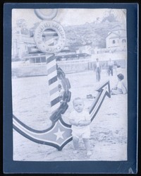 [Niño pequeño delante de imitación de ancla en balneario de Cartagena] [fotografía]. Cartagena : 1951. 1 fotografía : negativo sobre papel ; 9 x 7 cm .