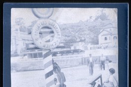 Niño pequeño, aparece en la fotografía delante de una imitación de ancla, de la que pende un salvavida donde se lee "Balneario Cartagena Chile 1951". Atrás, otros veraneantes y de fondo, algunas construcciones de esa localidad.