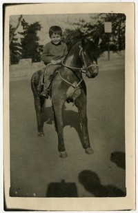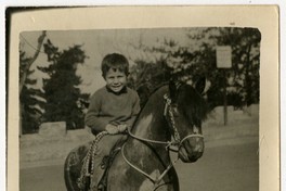 [Niño sobre poni de utilería] [fotografía]. [Santiago? : entre 1950 y 1960]. 1 fotografía : monocromo, gelatina sobre papel fibra ; 14 x 9 cm .
