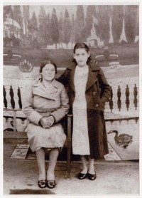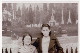 Mujer adulta, aparece en la fotografía sentada en una silla, junto a joven [madre e hija] que la acompaña de pie, delante de telón de fondo en el que se observa la pintura de un estanque con cisnes en un jardín, y de fondo, una hilera de álamos.