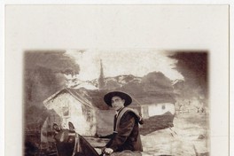 Hombre con apero de huaso, aparece en la fotografía detrás de caballo pintado en telón de fondo, en el que además se observa la pintura de un paisaje rural.
