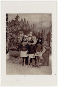Tres adolescentes, aparecen en la fotografía delante de telón de fondo, en el que se observa la pintura de un paisaje, con una casa en medio de un bosque de pinos.