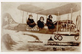 Tres mujeres adultas, aparecen en la fotografía detrás de avioneta pintada en telón de fondo, y en el que se lee "[Recuerdo]-Fiesta-de la raza", además se observa un montículo rocoso , dos embarcaciones menores, un muelle y en el horizonte, dos buques.