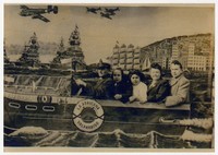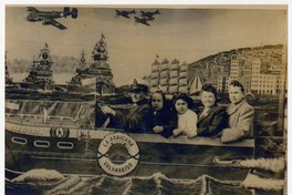 Familia compuesta por adultos y niñas, aparecen en la fotografía detrás de bote "La Araucana Valparaíso" pintado en telón de fondo, en el que además se observa en el paisaje marino, diversas embarcaciones y avionetas, y de fondo, edificios y construcciones en un cerro.
