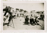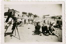 Dos mujeres y un hombre con traje de baño, aparecen en la fotografía en balneario no identificado, posando para la fotografía que será tomada con una cámara minutera, como puede observarse en la escena. De fondo, otros veraneantes y el mirador.