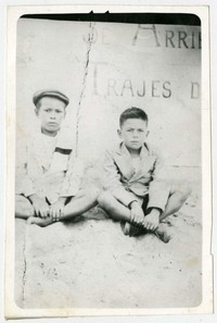 Un niño con boina aparece en la fotografía al lado de otro niño, con quienes miran a la cámara mientras permanecen sentados en la arena y delante de un muro donde se lee Se Arri[endan] trajes d[e] [...]".