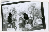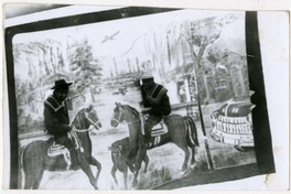 Dos hombres aparecen en la fotografía detrás de caballos pintados y delante de telón de fondo, donde se observa la pintura de un paisaje.