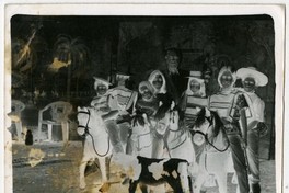 Familia compuesta por un señor adulto y niños, aparecen en la fotografía sobre cuatro ponis de utilería en una plaza pública no identificada.