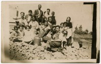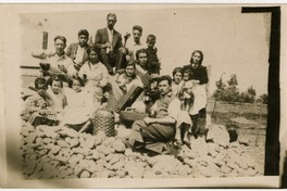 Grupo familiar, compuesto por adultos y niños, aparecen en la fotografía reunidos en un día de picnic sobre terreno con piedras en un recinto con cerca de alambre. Entre los objetos se observa un par de damajuanas con revestimiento de mimbre y un toca discos. De fondo, un muro de adobe.