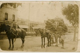 Un hombre adulto con sombrero, aparece en la fotografía sentado arriba de sacos en una carreta tirada por dos caballos que se encuentran detenidos en una calle con bandejón central. Tres niños con boina aparecen al lado de la carreta mirando en dirección a la cámara fotográfica. De fondo, se observa algunas tiendas comerciales, una de las cuales tiene un letrero donde se lee "La coqueta calzado".