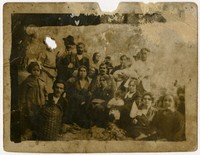 Grupo familiar compuesto por adultos y niños, aparece en la fotografía reunidos en lugar no identificado. Se observa entre los retratados a una mujer con guitarra y entre los objetos, una damajuana con revestimiento de mimbre.