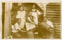 Mujer adulta sostiene un vaso que es servido por un hombre desde una damajuana con revestimiento de mimbre, frente a otro que sostiene una igual, y quienes aparecen en la fotografía delante de una mujer que tiene en su mano una olla de loza pequeña, y de un hombre con delantal blanco que descorre la cortina de entrada a una cocina.