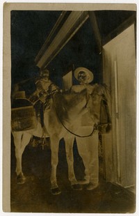 Niño pequeño, aparece en la fotografía montado a caballo y junto a un hombre adulto con sombrero que se encuentra de pie al lado del animal y afuera de una casa donde está la puerta abierta.
