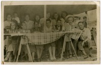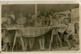 Grupo de personas, mayoritariamente mujeres adultas, aparecen en la fotografía detrás de una mesa de madera con mantel cuadrillé, ubicada bajo un toldo de tela. Desde una esquina de la mesa, tres hombres adultos miran en dirección a la cámara.
