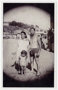 Mujer y hombre adultos, aparecen en la fotografía junto a una niña pequeña en un balneario no identificado, en el que se observa de fondo, una colina con árboles, y más acá, ropa tendida y algunas construcciones.