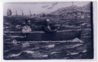 [Mujer y joven detrás de bote pintado en telón de fondo] [fotografía]. [Chile : entre 1940 y 1950]. 1 fotografía : monocromo, gelatina sobre papel fibra ; 9 x 14 cm .