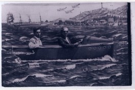 Mujer mayor con lentes de sol, aparece en la fotografía junto a un joven en el bote "Lucero" pintado en telón de fondo, en el que además se observa otras embarcaciones mayores, avionetas y un muelle.