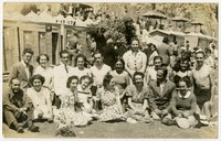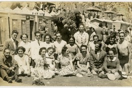 Grupo de jóvenes de ambos sexos, aparecen en la fotografía en un balneario no identificado, y en el que se observa las tiendas del lugar y a otros veraneantes detrás de los retratados.