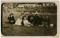 Grupo familiar compuesto mayoritariamente por mujeres adultas con sombreros en un balneario no identificado. De fondo, dos construcciones en las cuales se lee "[Restaurant] a la carta" y "Terraza para baile".