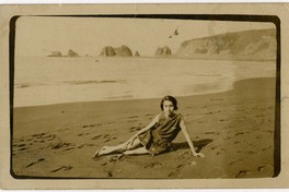 Joven con vestido, aparece en la fotografía recostada frente al mar, en balneario no identificado.