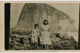 Mujer adulta con sombrero, aparece en la fotografía junto a un niño que tiene un balde, con quien están sentados en roquerío de balneario de Constitción, de espalda a la "Piedra de la Iglesia", cerca de la cual se observa a otros veraneantes.