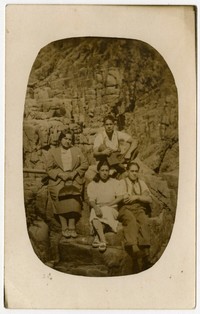 [Familia en montículo rocoso de Constitución] [fotografía]. Constitución : 1942. 1 fotografía : monocromo, gelatina sobre papel fibra ; 14 x 9 cm .