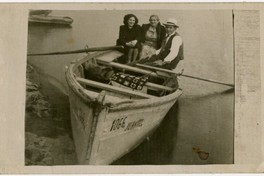 Dos mujeres adultas, aparecen en la fotografía junto a un hombre con sombrero, con quien se encuentran al interior del bote "Juanito" a orillas de un balneario no identificado.