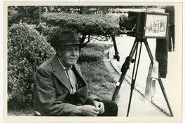 Hombre adulto con sombrero sentado frente a una cámara fotográfica de cajón utilizada por un fotógrafo minutero, en una plaza pública, en la que se observa entre los arbustos a otras personas en el lugar.