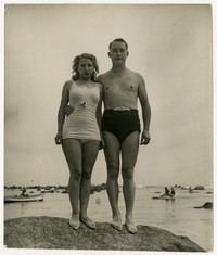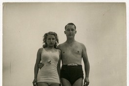 [Pareja de pie sobre roca de un balneario] [fotografía]. [Chile : entre 1930 y 1940]. 1 fotografía : monocromo, gelatina sobre papel fibra ; 14 x 12 cm .