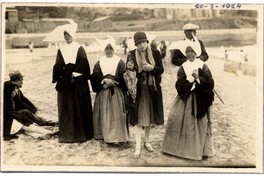 [Mujer y religiosas en balneario] [fotografía]. [Chile] : 1924. 1 fotografía : monocromo, gelatina sobre papel fibra ; 9 x 14 cm. .