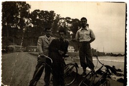 Tres jovenes retratados junto a sus bicicletas, aparecen de espalda a un balneario y a las casas de una localidad desconocida.