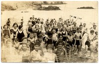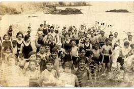 Grupo de bañistas, principalmente jovenes y niños, aparece en la fotografía en el mar y con trajes de baño. Más atrás, grupo de jovenes se sostienen de una cuerda.