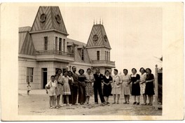 [Grupo de personas fuera de Hotel Ross en Pichilemu] [fotografía].