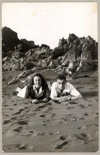 [Mujer y hombre recostados en balneario de Pichilemu] [fotografía]. Pichilemu : 1947. 1 fotografía : monocromo, gelatina sobre papel fibra ; 14 x 9 cm .