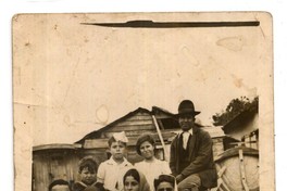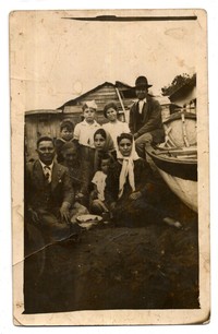 Familia compuesta por mujeres con pañuelos en la cabeza y hombres adultos, aparecen en la fotografía junto a niños sentados en balneario de San Vicente y junto a un bote a remo. De fondo, se observa una casa de madera.