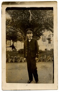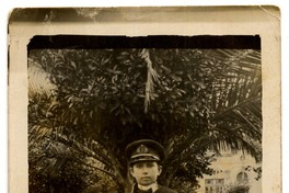 Niño con indumentaria, aparentemente de marino y humita, aparece retratado en la Plaza de Talcahuano, delante de una palmera. Atrás, se observa una construcción y a un hombre de espalda sentado en una banca de esa plaza.