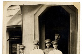 Carabineros del Batallón Andino 3 "Tucapel", en una escalinata de entrada, justo delante de la puerta de un edificio.