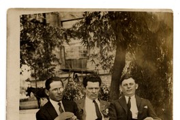 Tres hombres con los sombreros en las manos, aparecen en la fotografía sentados en un sillón de mimbre ubicado en una plaza, en la que se observa además una carreta con caballos de fondo.