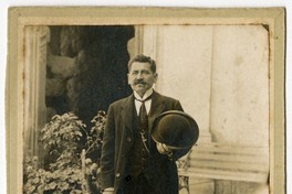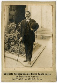 [Hombre sostiene su sombrero y bastón en un jardín] [fotografía]. Santiago : Gabinete Fotográfico del Cerro Santa Lucía, [191-?]. 1 fotografía : monocromo, gelatina sobre papel fibra ; 14 x 10 cm. .